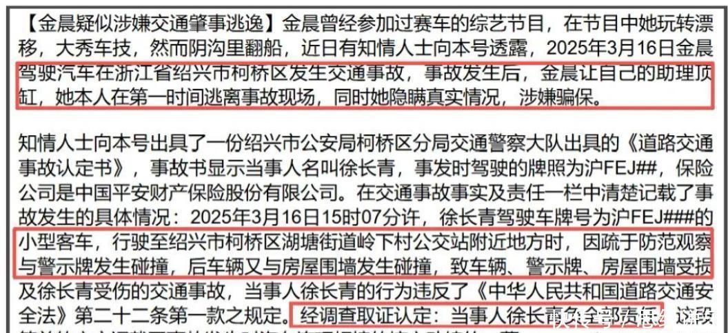 要说这事闹得多离谱?监控清清楚楚拍到她本人握着方向盘,撞了警示牌又蹭上围墙,结果她和经纪人脚底抹油溜了,留助理在现场顶包。交警当时还真信了,认定书都写助理全责。要不是保险公司理赔时调监控发现猫腻,这事儿估计就悄没声地过去了——妥妥的肇事逃逸加骗保嫌疑啊。 更让人咂舌的是后续。保险公司刚准备报警,金晨立马主动找上门,拍胸脯说所有损失她个人扛,只求撤案。你猜怎么着?人家真撤了。至于她使了什么招,外人哪能知道。但法律这关哪是这么好糊弄的?就算没出人命,逃逸照样可能吊销驾照,要是骗保坐实,蹲局子都不是没可能。